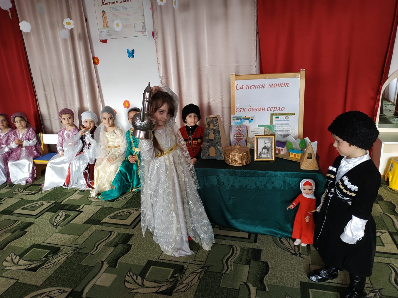 С целью воспитания любви к своему родному языку, в нашем детском саду было проведено мероприятие «Ларбе мотт, хазбе и…», подготовленное воспитателем Хастаевой Малкан Жалаудиевной. Мероприятие провели с воспитанниками средней группы «Радуга». В ходе мероприятия были прочитаны стихи, спеты песни на чеченском языке. Особое впечатление произвел танец в исполнении воспитанниц средней группы «Радуга».